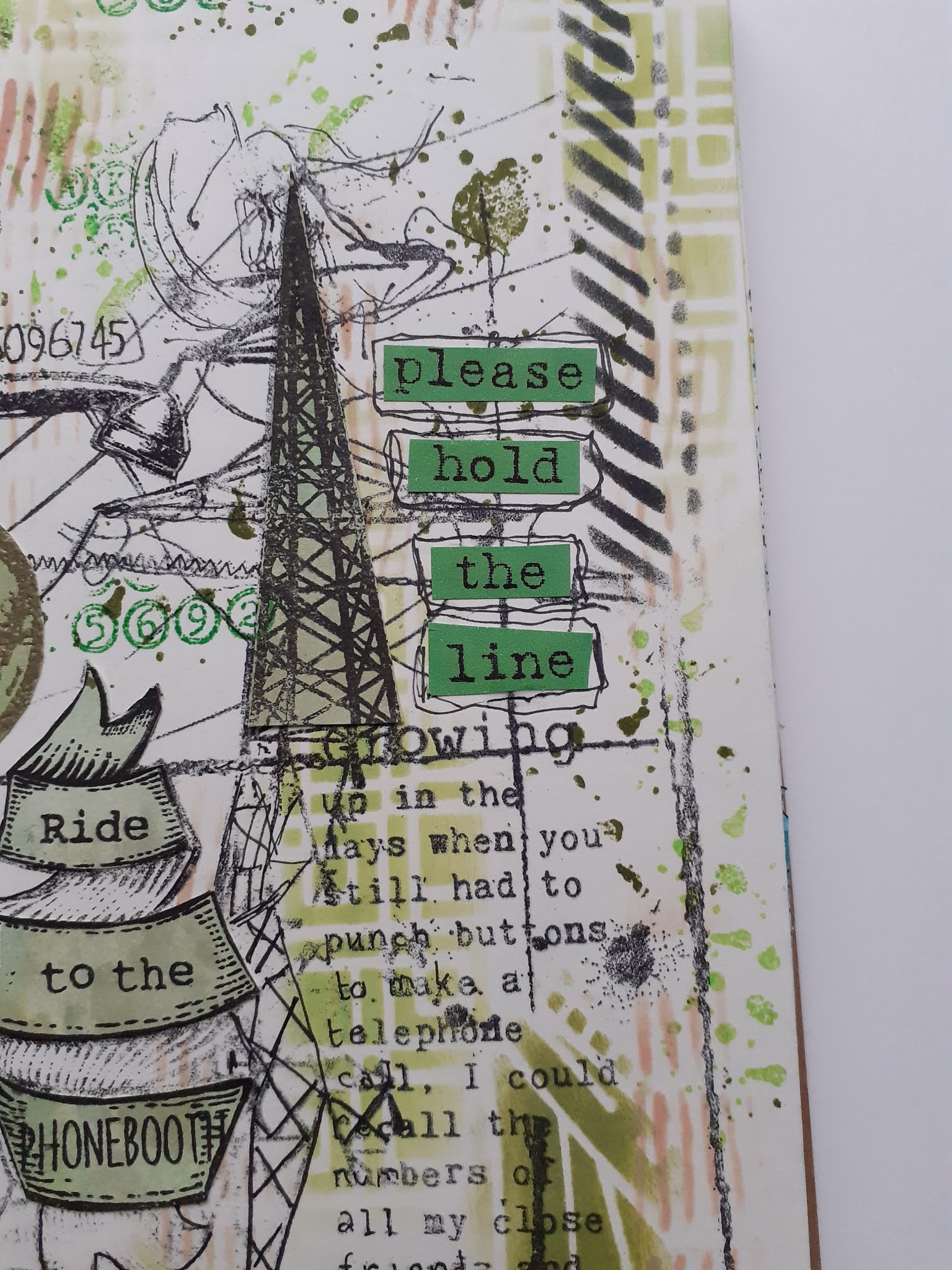 I used a favourite Lavinia stamps stencil, masked off with some copier paper with a hole torn out of the middle. I added some sponged paint around the edge. The stamps are by Paper Artsy and Chou and Flowers.