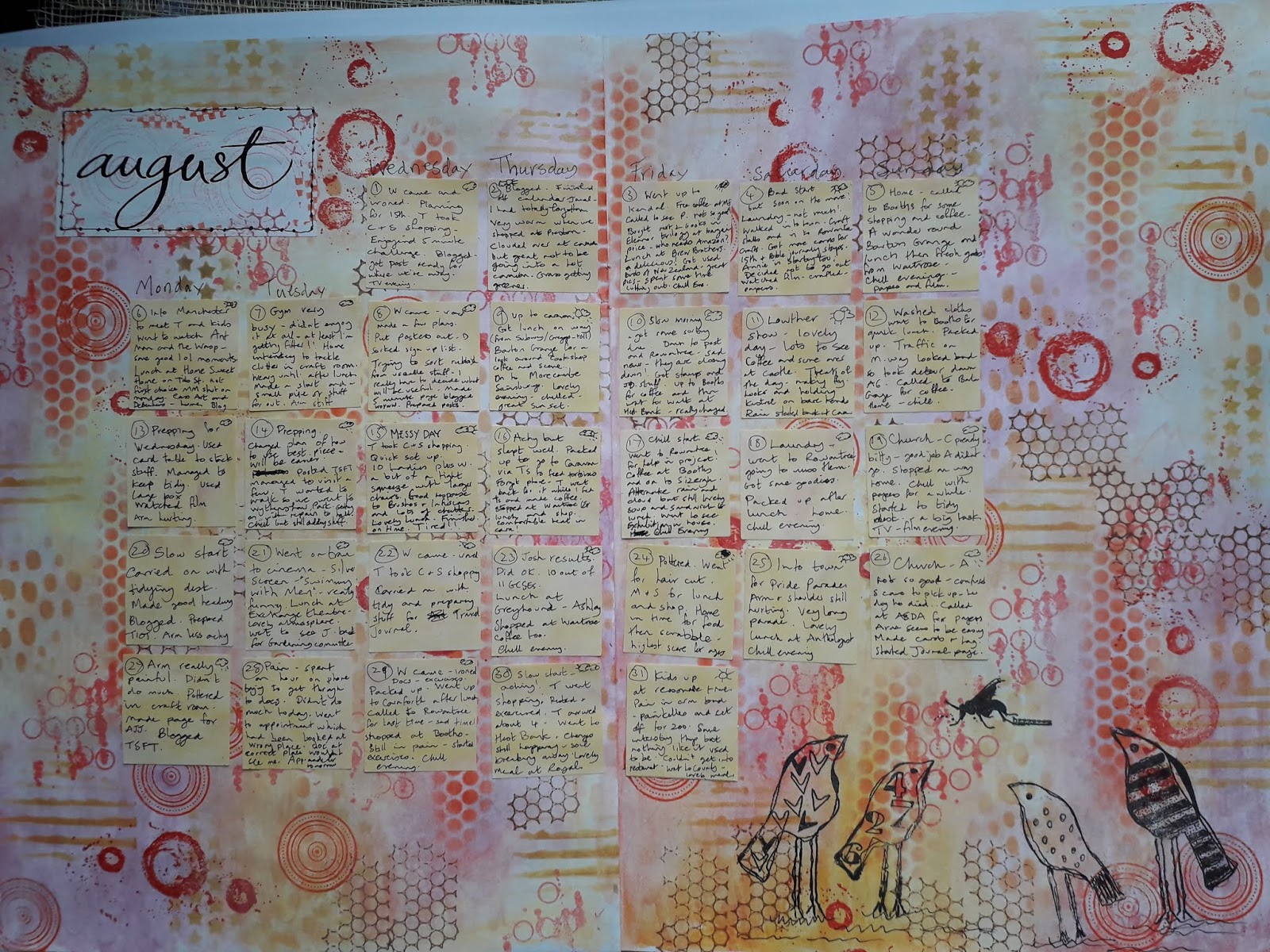 Your finished August page is lovely - one of my favorite color schemes and I love the quirky birds.